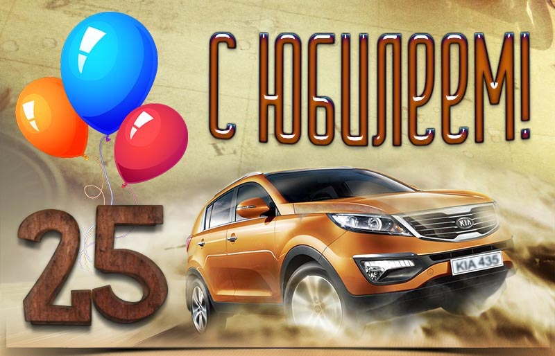 Открытка с днем рождения 25 лет юбилей. Открытка на 25 лет - поздравление с юбилеем с машиной и шариками.