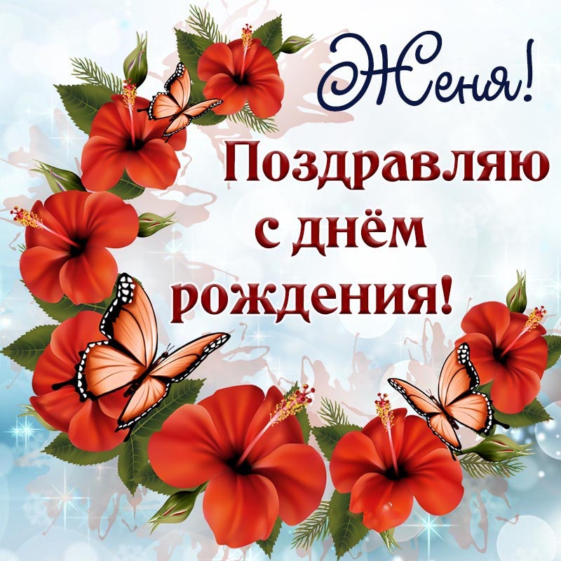 Открытка с днем рождения Евгения Женя женщина. Открытка: гибискус и надпись - Женя, поздравляю с днем рождения.