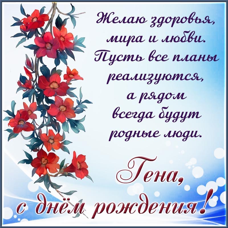 Открытка с днем рождения Геннадий Гена. Открытка на день рождения - цветы и милое пожелание Гене здоровья, мира и любви.