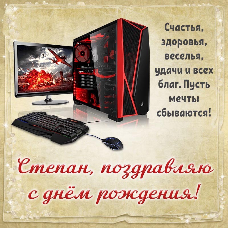 Открытка с днем рождения Степан. Картинка с компьютером Степану, пусть мечты сбываются, с днем рождения.