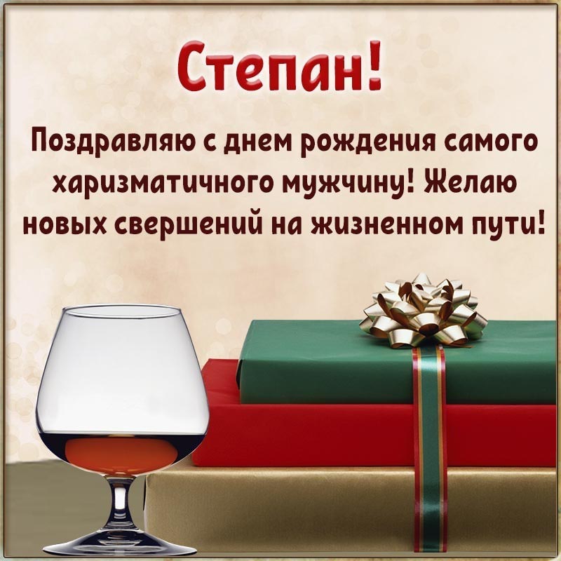 Открытка с днем рождения Степан. Открытка с подарками и бокалом для харизматичного мужчины, Степану на день рождения.