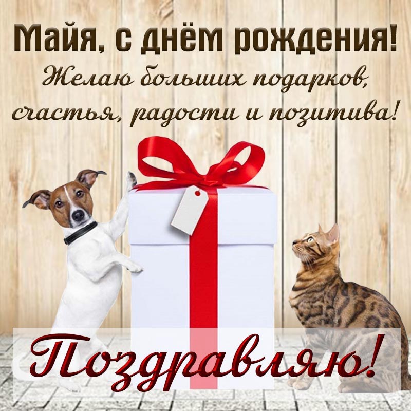 Открытка с днем рождения Майя. Забавная картинка с кошкой, собакой и подарком Майе на день рождения.