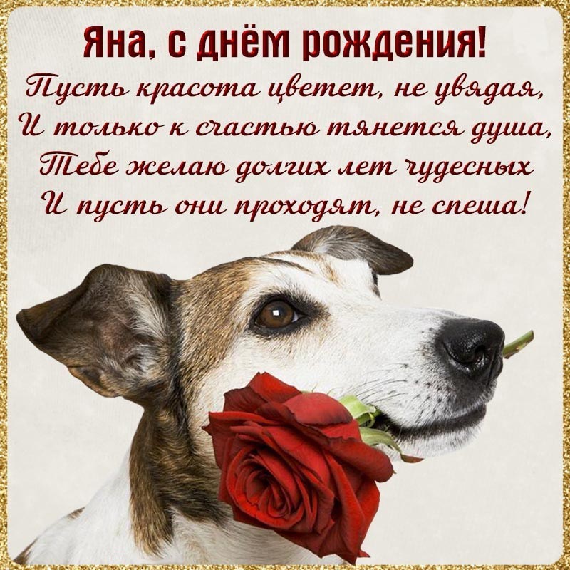 Открытка с днем рождения Яна. Очаровательная открытка с собакой и стихотворением Яне на день рождения.