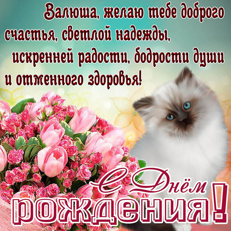 Открытка с днем рождения Валентина Валя женщина. Открытка с милым котиком и цветами Валюше на День рождения.