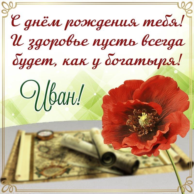 Открытка с днем рождения Иван Ваня. Роскошная открытка с картами и цветком в рамочке Ивану на день рождения.