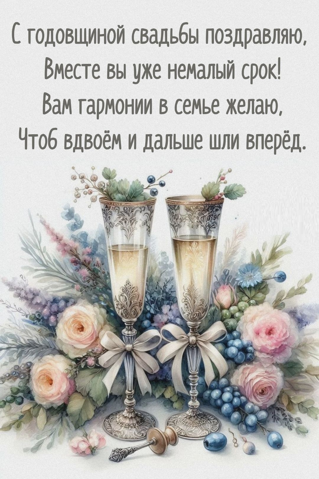 Годовщина свадьбы. Бокалы и цветы, пожелание.
