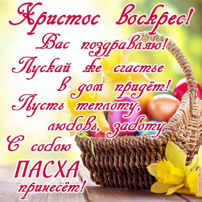Христос воскрес! Вас поздравляю! Пускай же счастье в дом придет! Пусть теплоту, любовь, заботу С собою Пасха принесет!