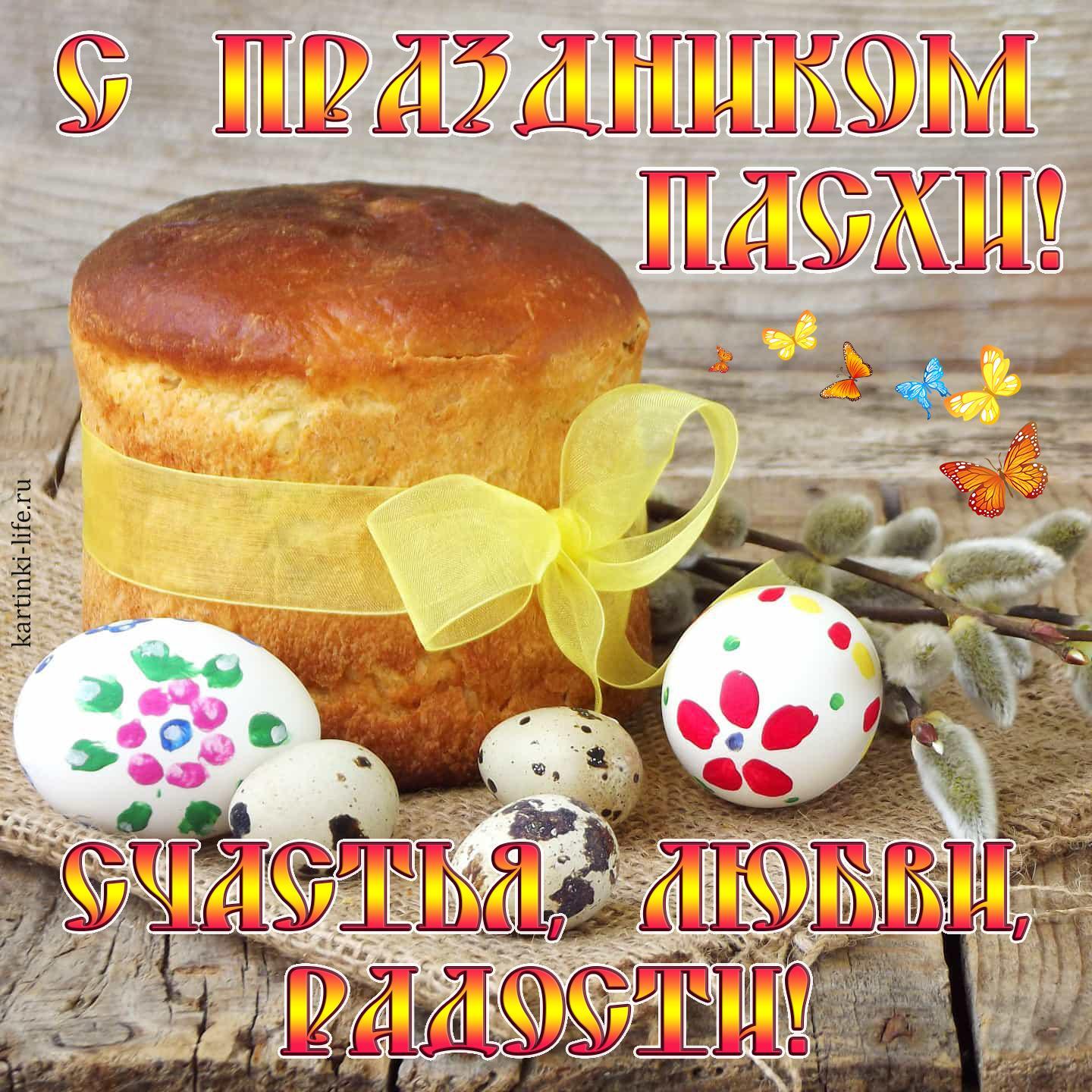 Каталог С праздником Пасхи! Счастья, любви, радости! Красивая открытка с Пасхой, поздравление с Пасхой; пасхальный кулич, перевязанный желтой лентой, раскрашенные яйца и веточки вербы.