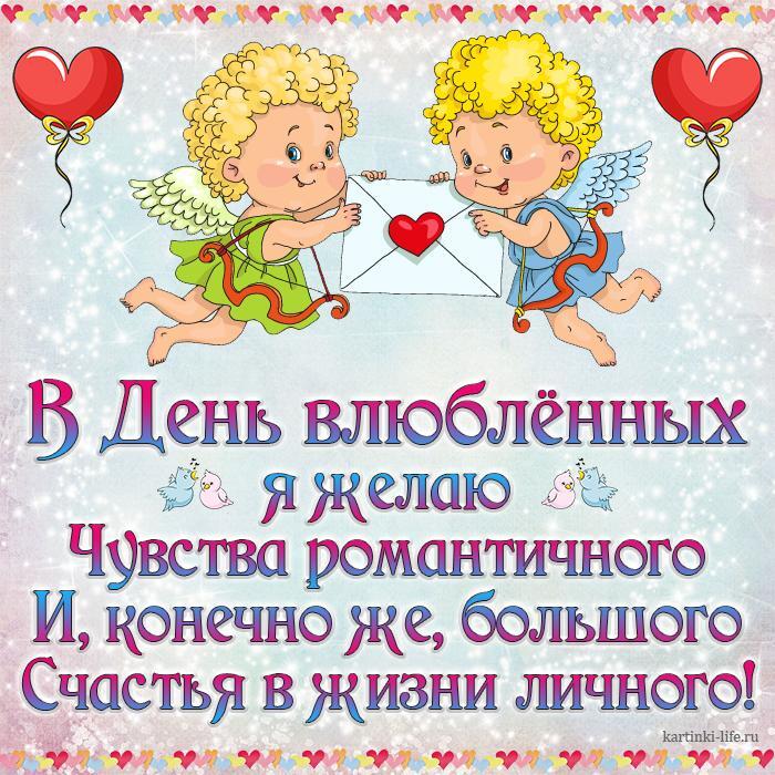 Каталог В День влюбленных я желаю Чувства романтичного И, конечно же, большого Счастья в жизни личного! Красивая открытка с Днем влюбленных, ангелочки держат в руках любовное послание.
