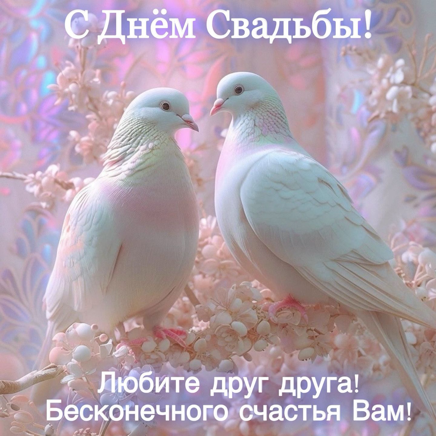 Красивая открытка с днем свадьбы и пожеланием. Белые голуби на фоне цветов.