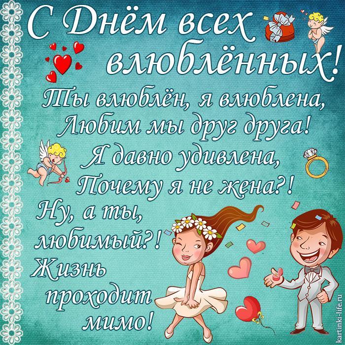 Намек парню на женитьбу: С Днем всех влюбленных! Ты влюблен, я влюблена, Любим мы друг друга! Я давно удивлена, Почему я не жена?! Ну, а ты, любимый?! Жизнь проходит мимо!