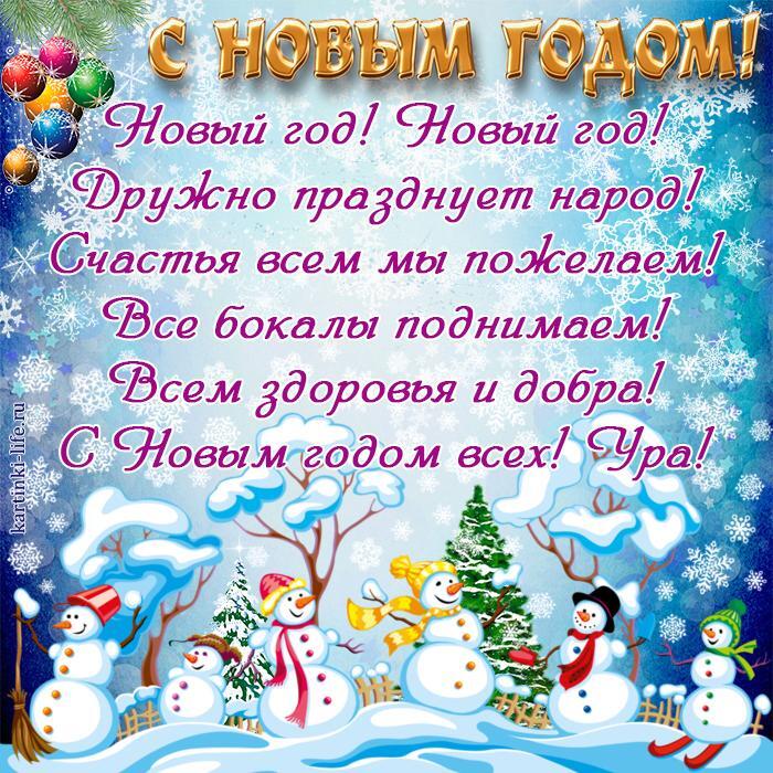 Новый год! Новый год! Дружно празднует народ! Счастья всем мы пожелаем! Все бокалы поднимаем! Всем здоровья и добра! С Новым годом всех! Ура!