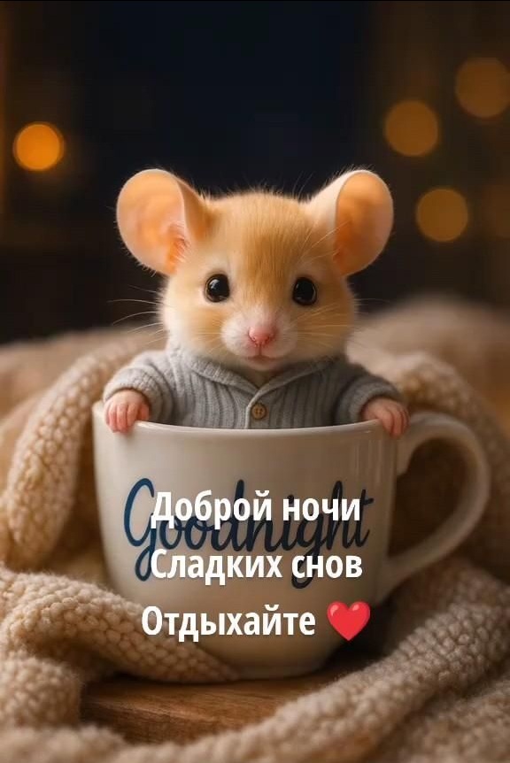 Открытка доброй ночи, сладких снов, отдыхайте. Мышонок в чашке с надписью good night.