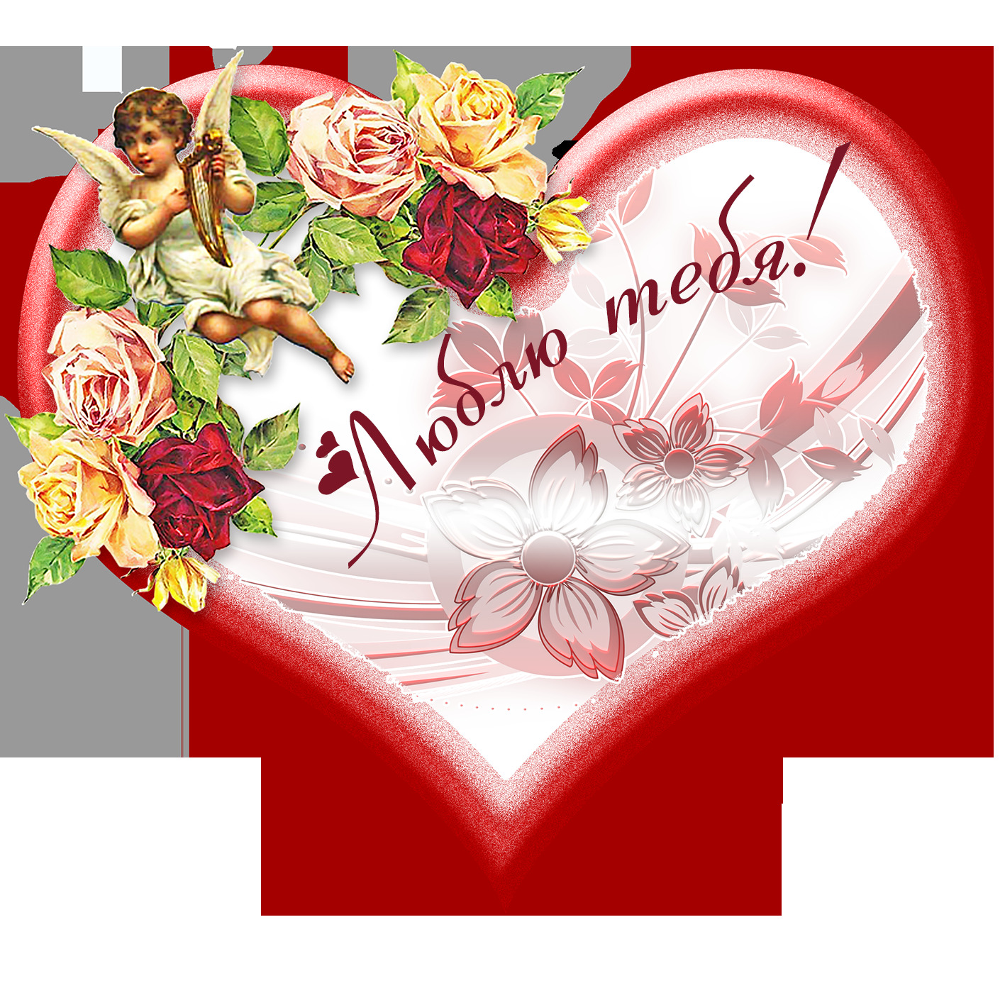 Открытка люблю тебя. Валентинка с ангелом и розами.
