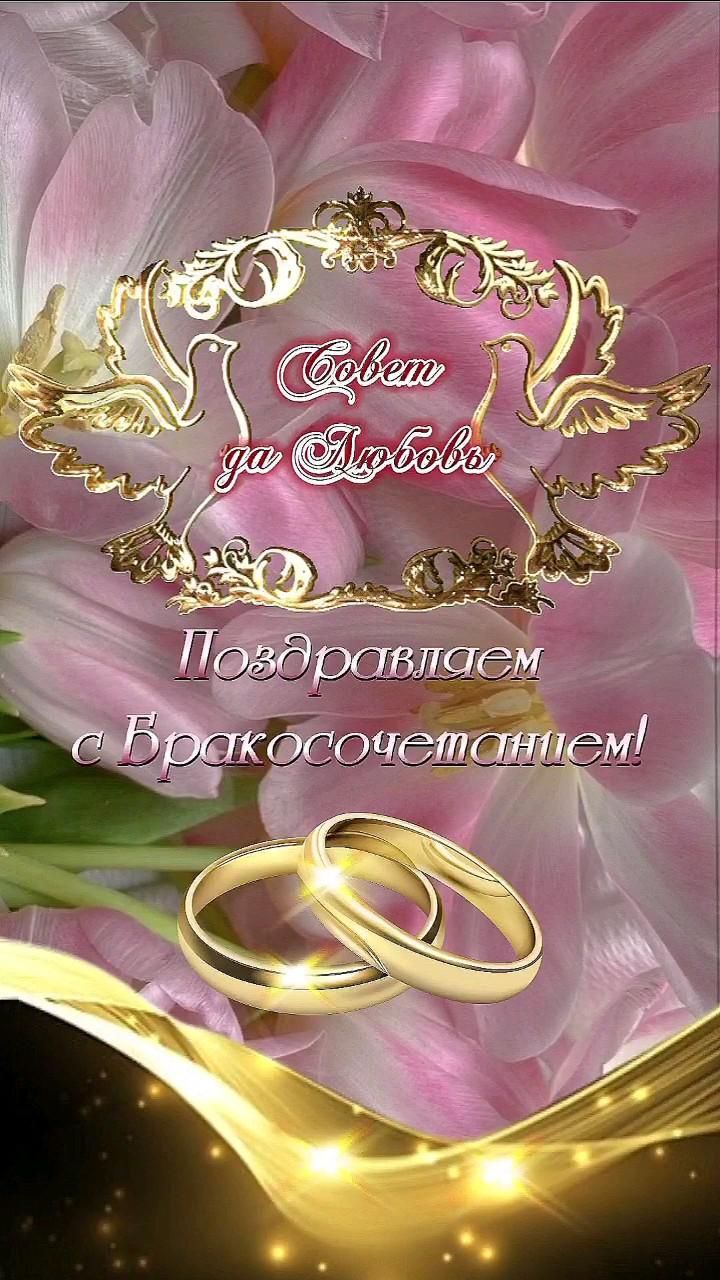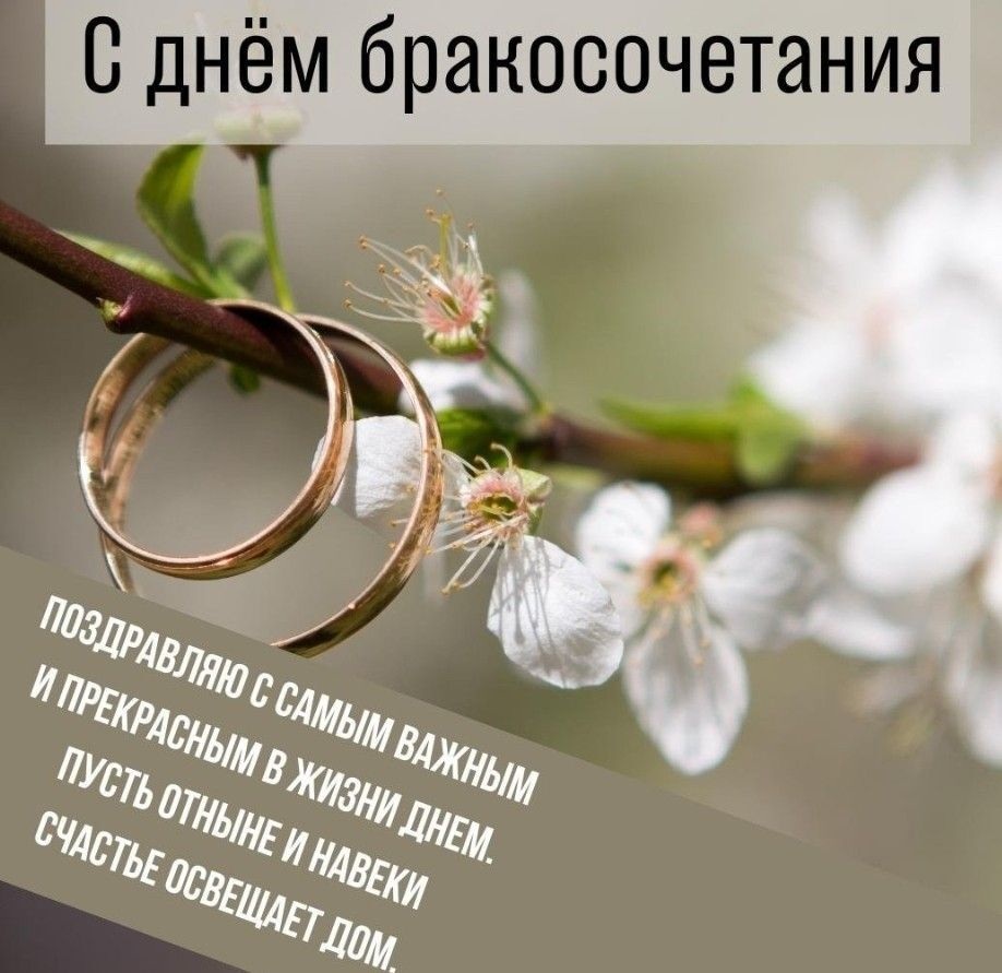 Открытка на бракосочетания с поздравлением. Цветы и обручальные кольца.