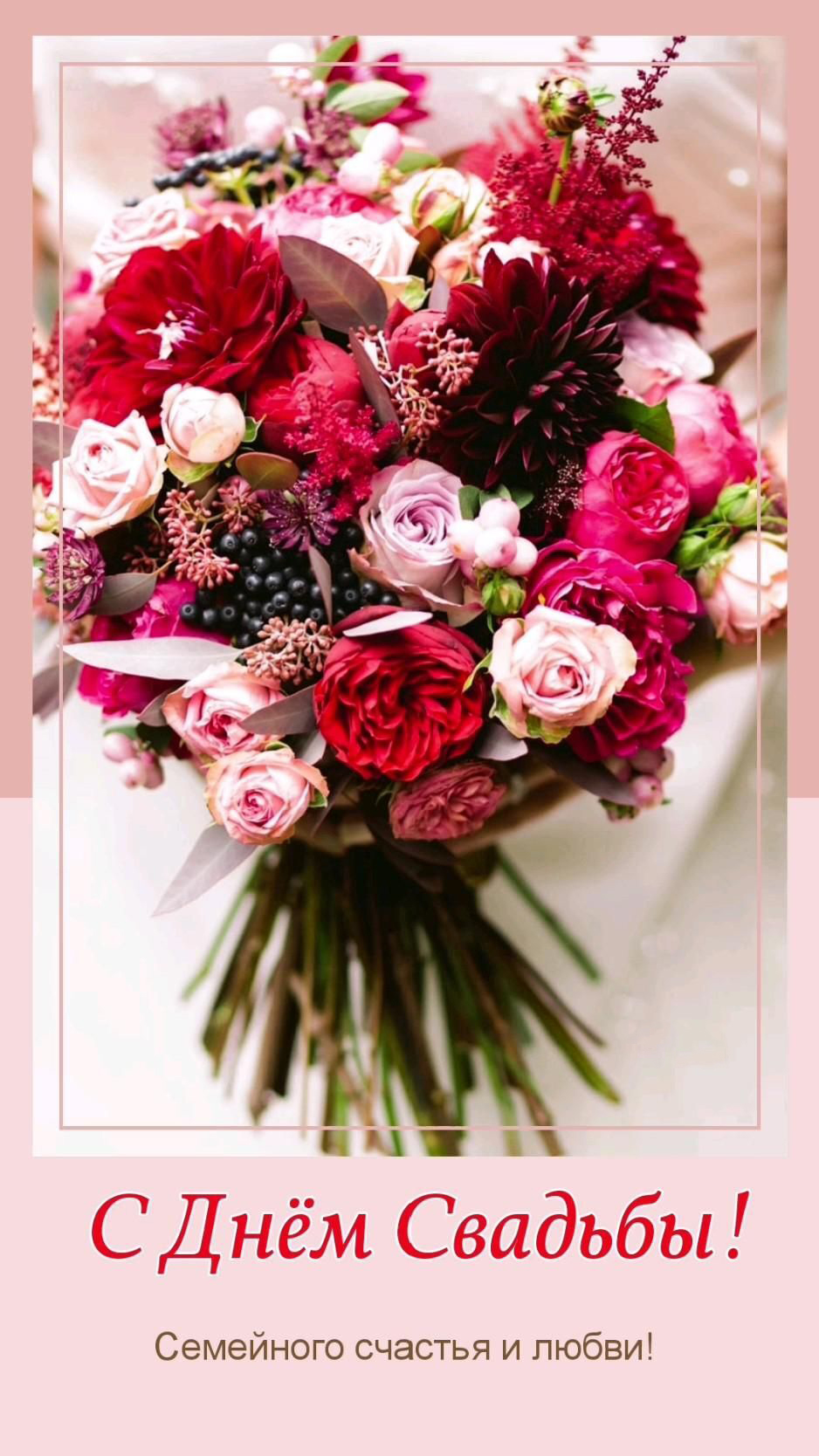 Открытка на день свадьбы с пожеланием семейного счастья и любви. Букет цветов.