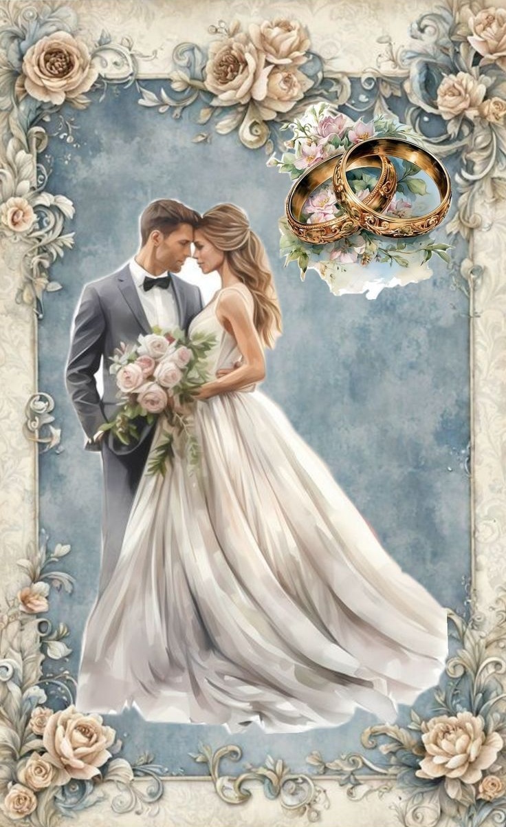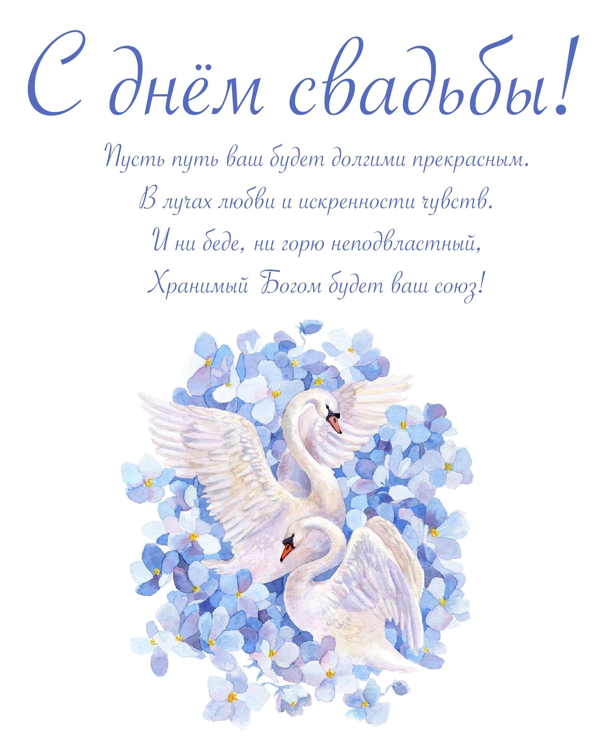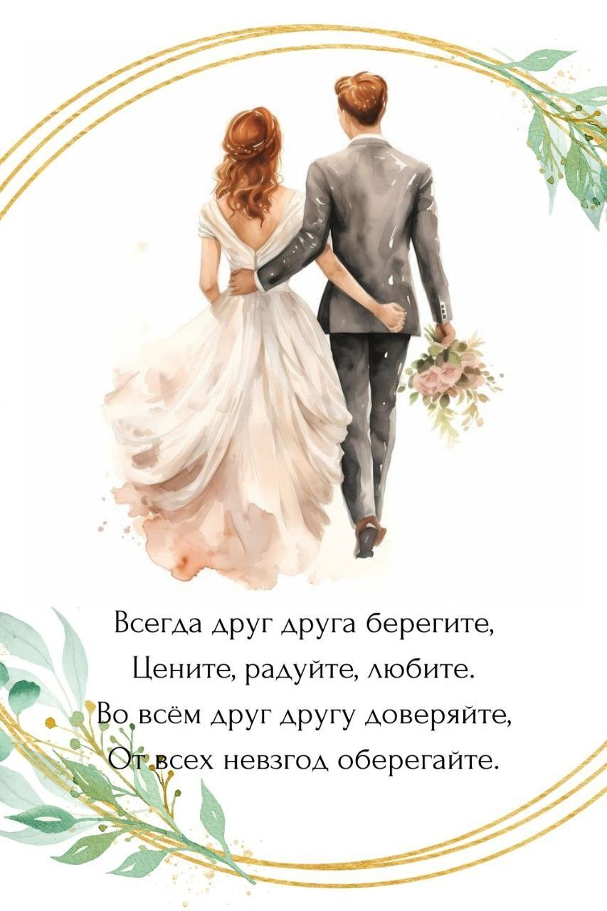 Открытка на день свадьбы с пожеланиями. Жених и невеста идут обнявшись.