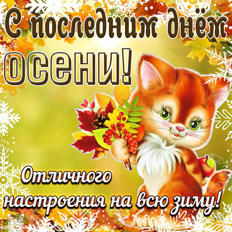 Открытка на осень. Милый котик на открытке с последним днем осени.