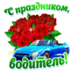 Открытка с Днем автомобилиста gif анимационная. Приезжает синяя машинка.