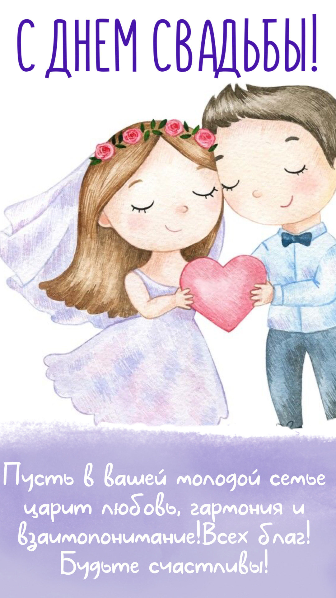 Открытка с днем бракосочетания с пожеланием. Жених и невеста держат свои руки в виде сердечка.