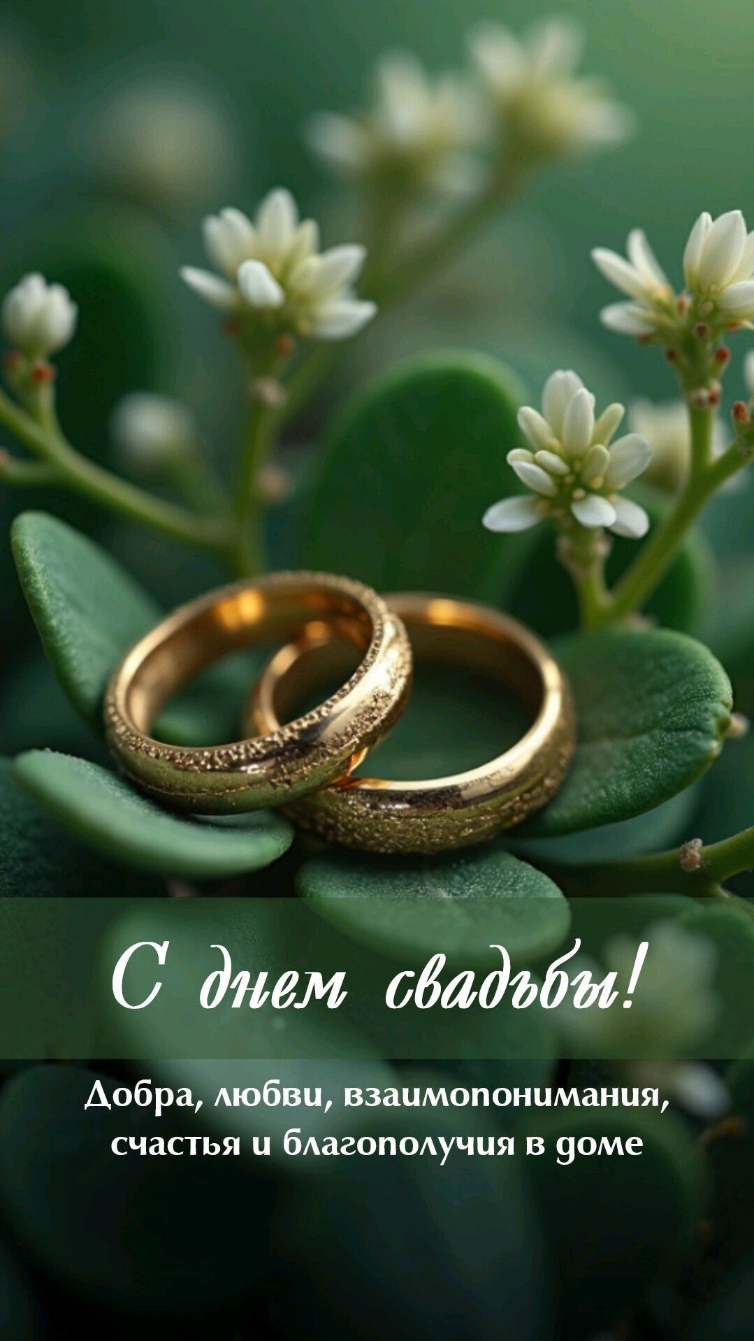 Открытка с днем бракосочетания. Зеленый фон, пожелание, цветы, голуби, кольца.