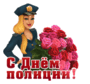 Открытка с днем полиции gif анимационная. Девушка в форме и красные розы.