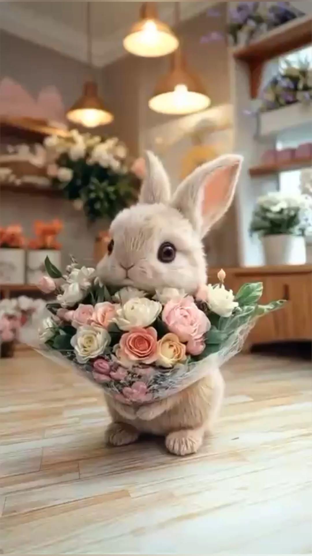 Открытка с днем рождения без текста. Милый зайчик с букетом цветов.