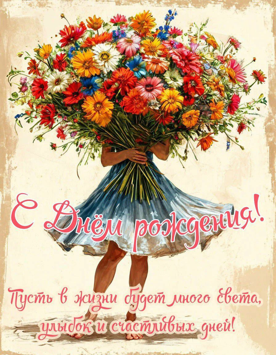 Открытка с днем рождения. Девочка с огромным букетом полевых цветов. Пожелания.