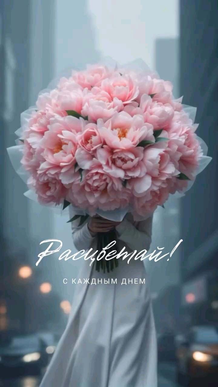 Открытка с днем рождения девушке женщине с пожеланием. Расцветай с каждым днем. Огромный букет розовых цветов в руках девушки.