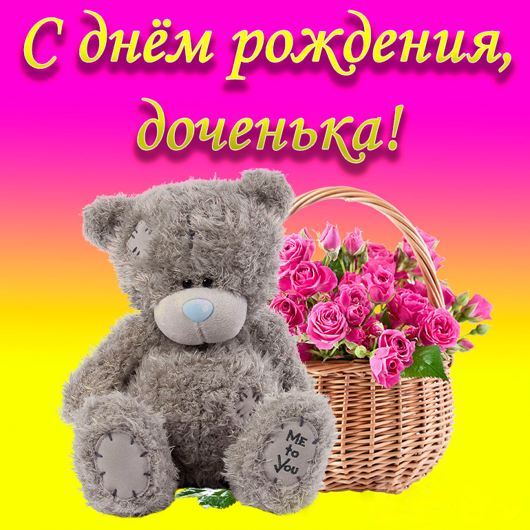 Открытка с днем рождения дочь. Мишка с желтой розой.