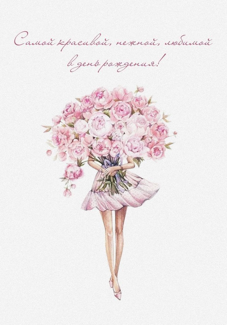 Открытка с днем рождения дочь. От родителей. Цветы и девушка.