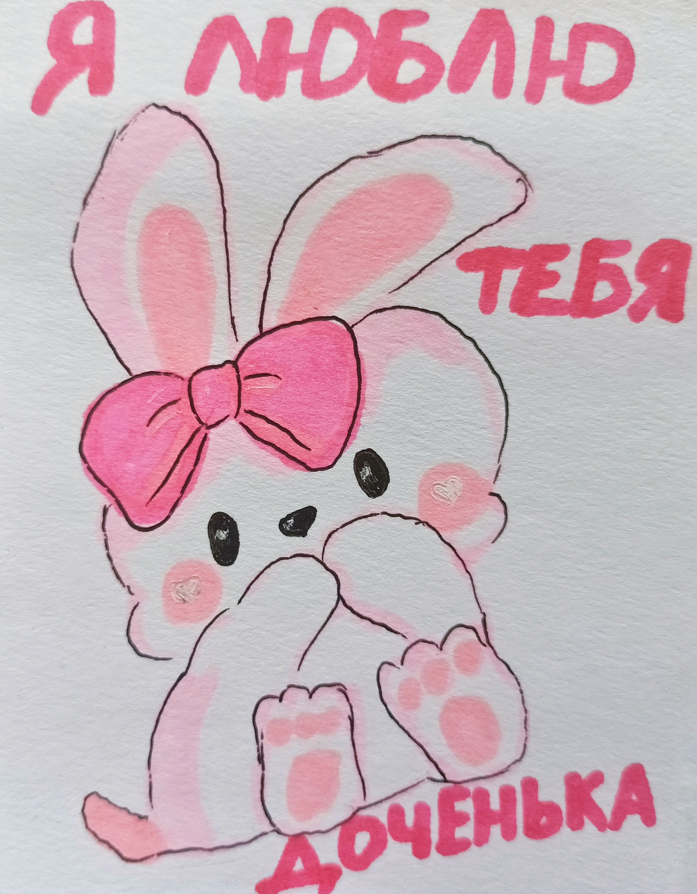 Открытка с днем рождения дочь. Зайчик с розовыми цветами.