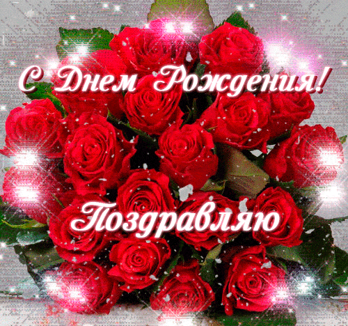 Открытка с днем рождения gif анимационная блестящая. Красные розы.
