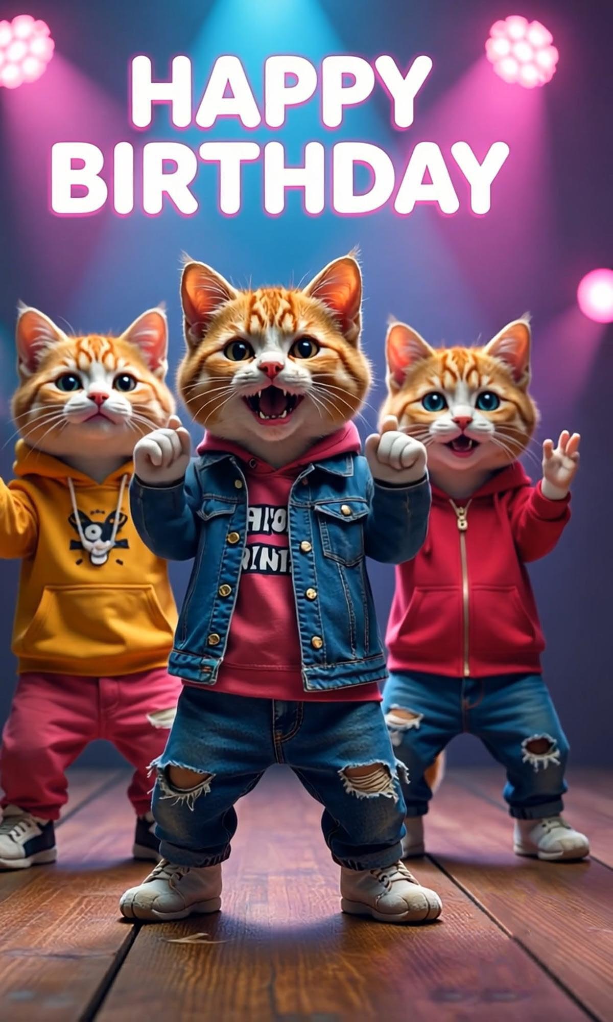 Открытка с днем рождения. Happy Birthday. Котики в танце.