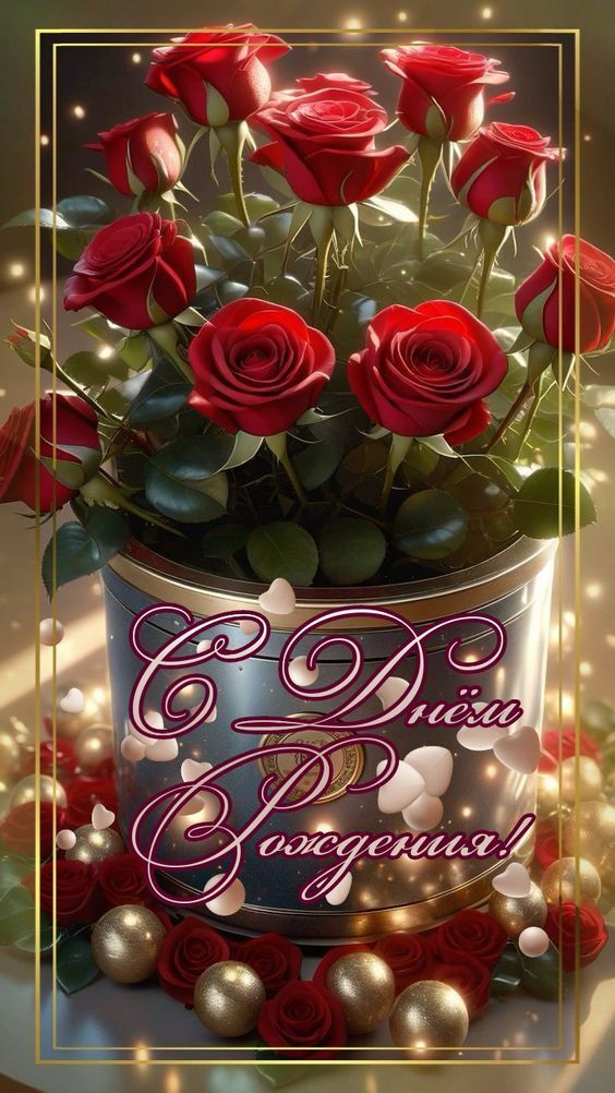 Открытка с днем рождения. Красные розы в красивом оформлении.