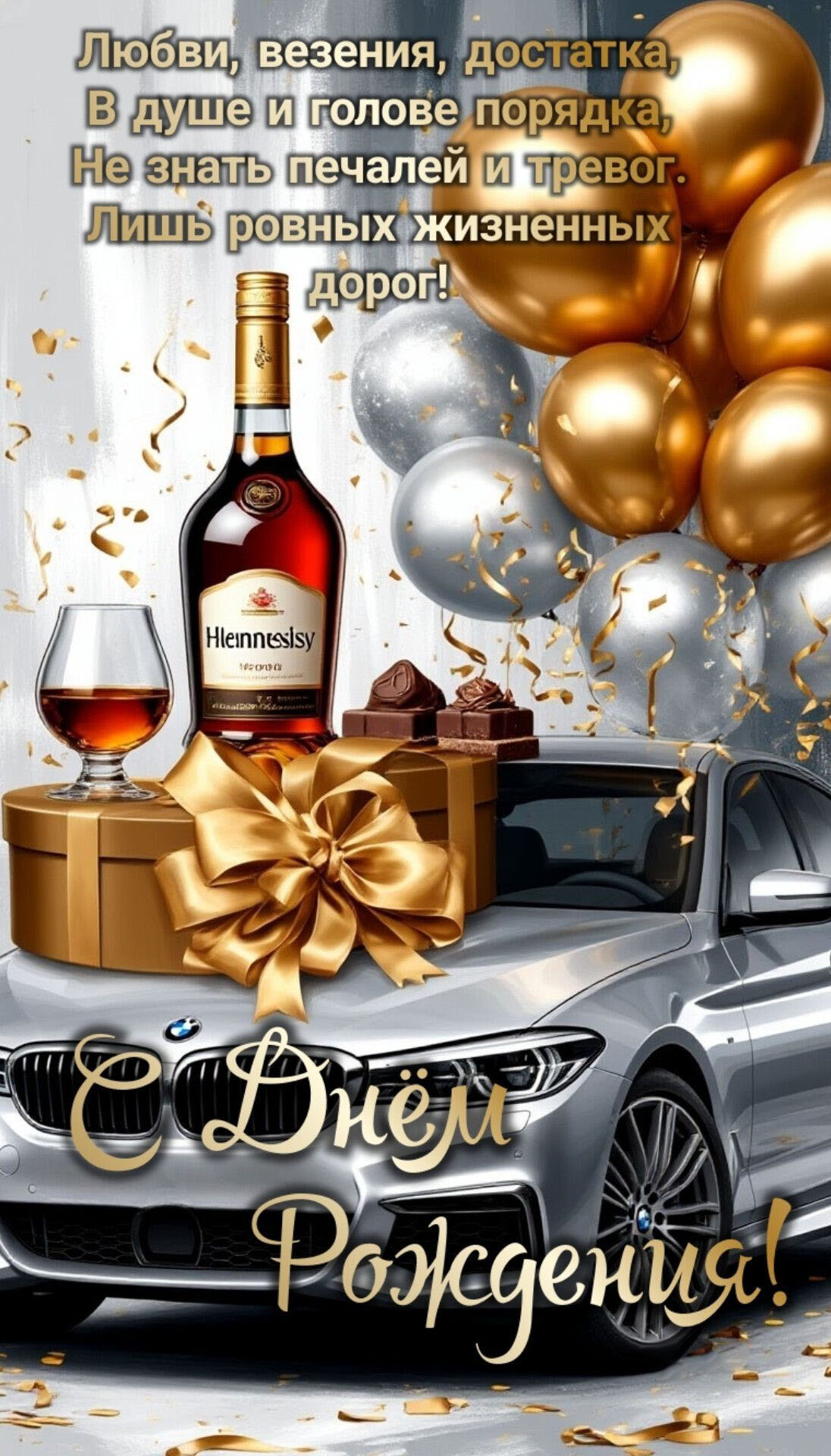 Открытка с днем рождения мужчина. Пожелания, автомобиль, коньяк.
