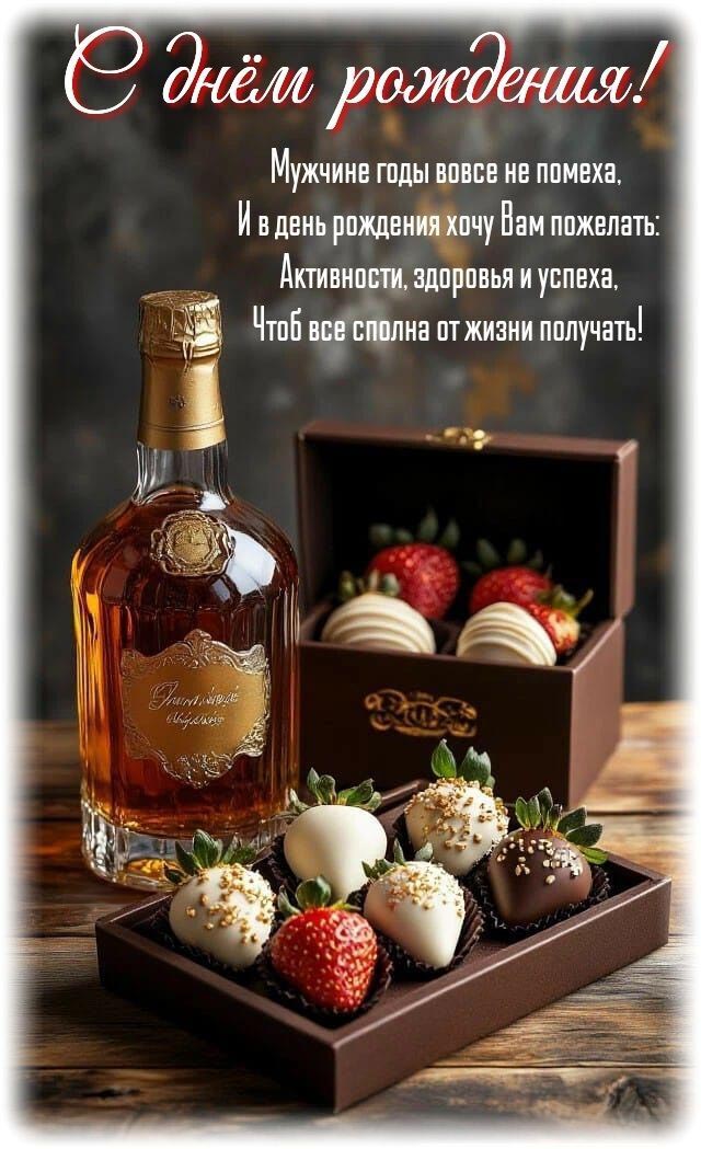 Открытка с днем рождения мужчина. Пожелания для мужчины. Коньяк и конфеты.