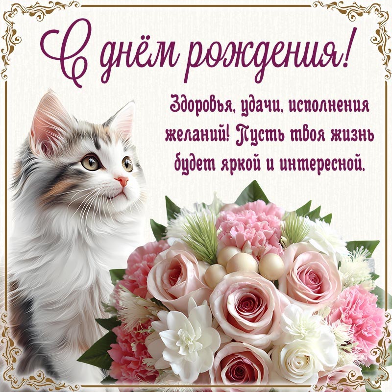 Открытка с днем рождения. Очаровательная открытка с котом и букетом для девочки на день рождения.