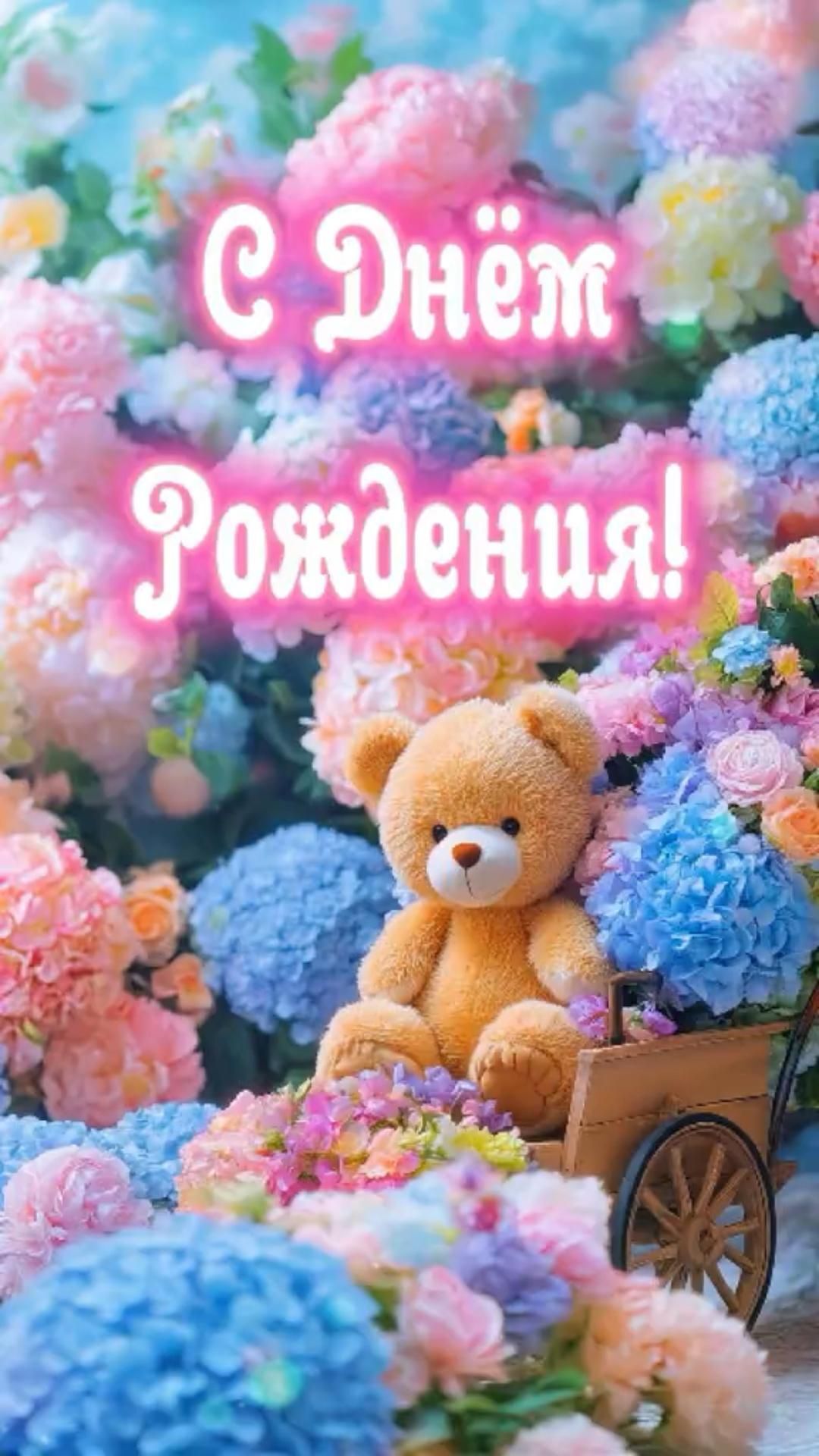 Открытка с днем рождения. Плюшевый мишка с цветами.