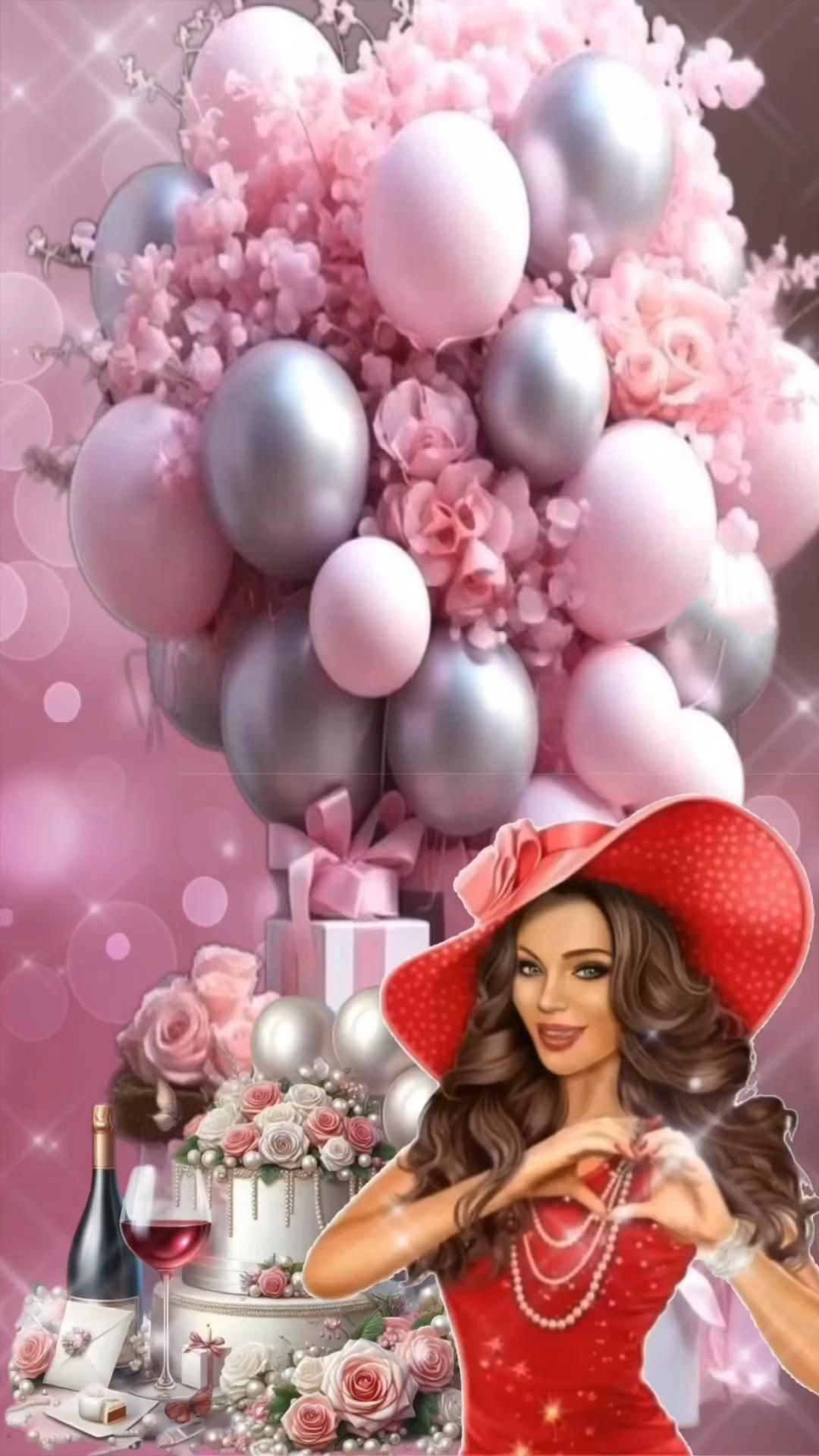 Открытка с днем рождения подруга. Без текста. Девушка в шляпе показывает сердечко руками, шарики, торт, шампанское.