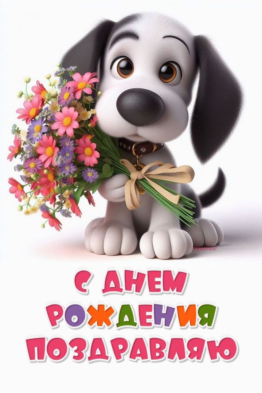 Открытка с днем рождения ребенку. Милая собачка с цветами.