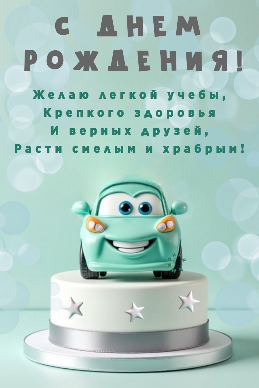 Открытка с днем рождения ребенку. Пожелания мальчику. Автомобильчик на торте.