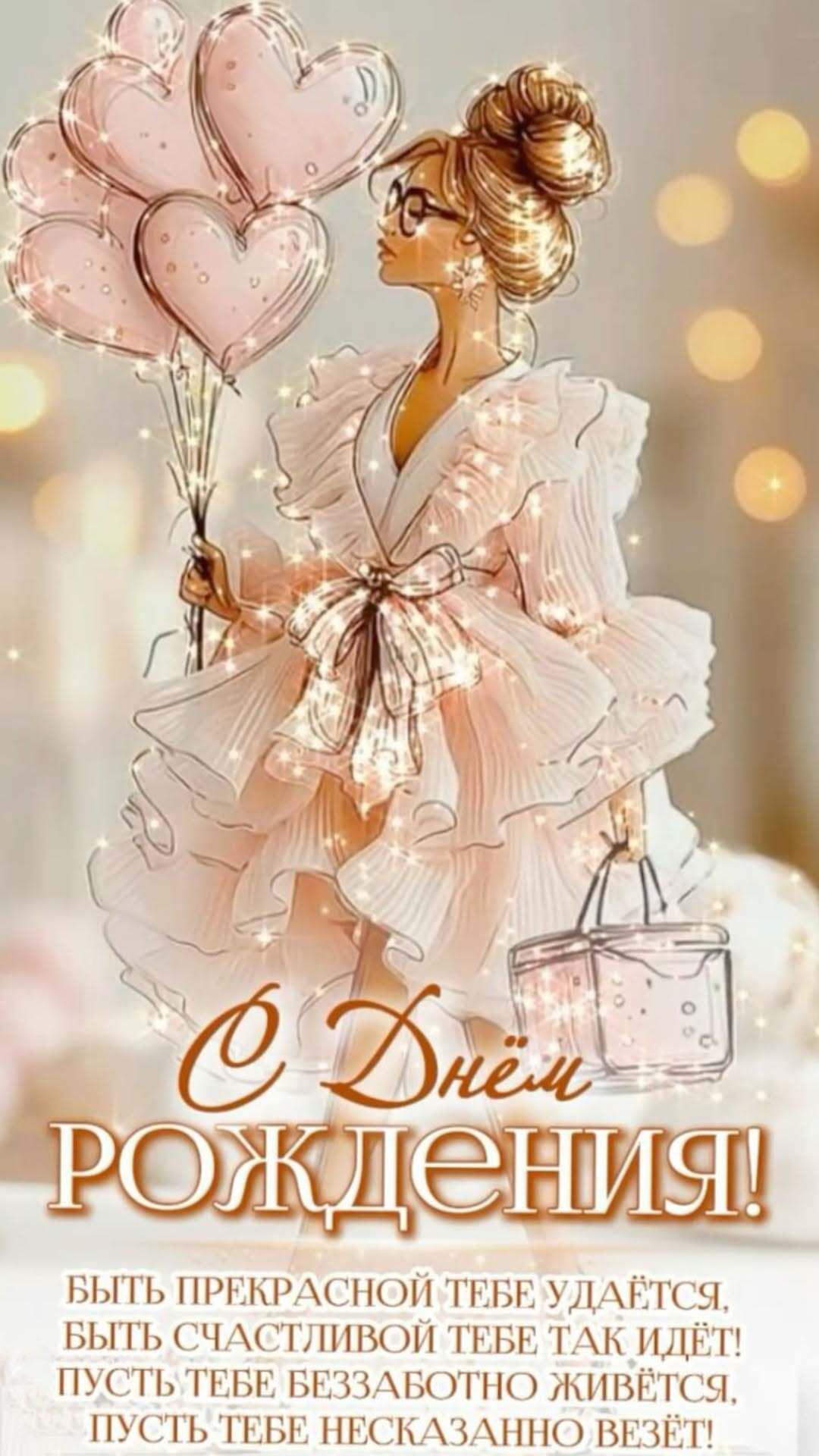 Открытка с днем рождения женщина. Девушка с розовыми шариками, пожелания.