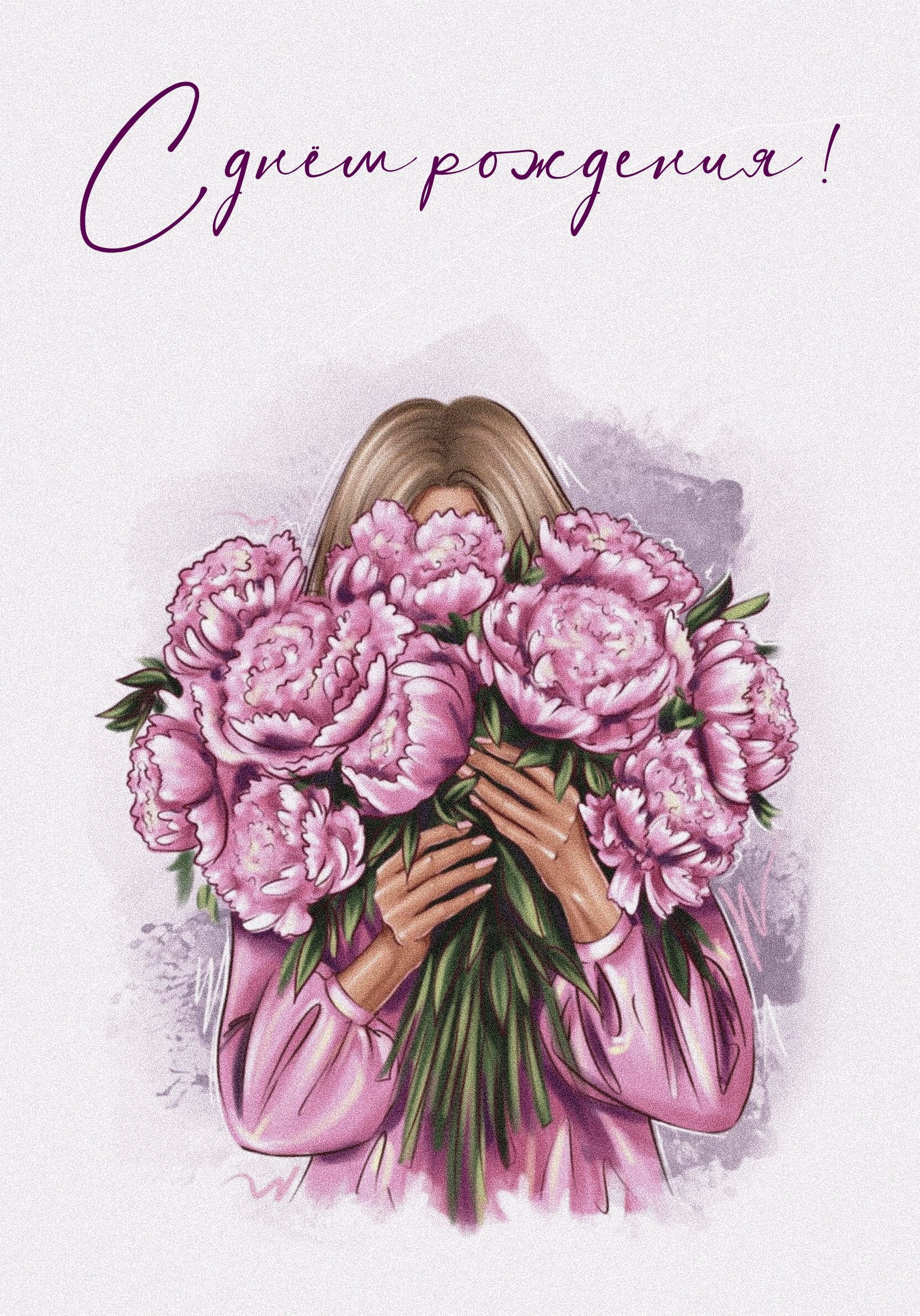 Открытка с днем рождения женщина. Для девушки. Девушка с розовыми цветами.