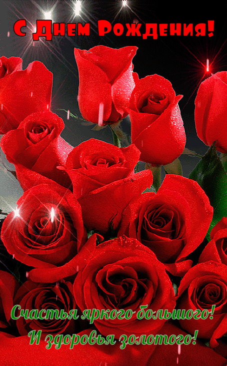 Открытка с днем рождения женщина gif анимационная мерцающая. Красные розы и пожелания.