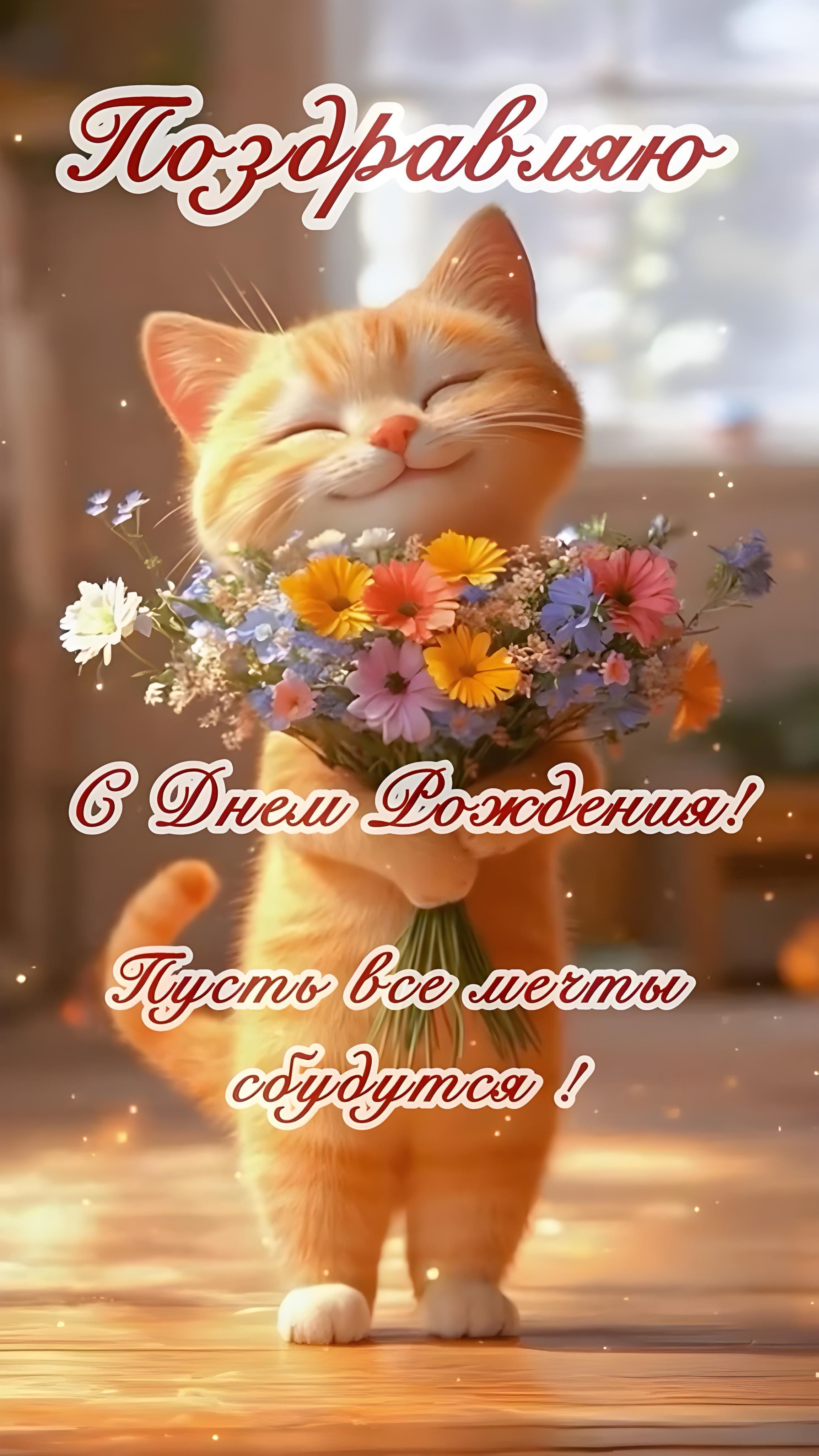 Открытка с днем рождения женщина. Котик с цветами. Пожелания.