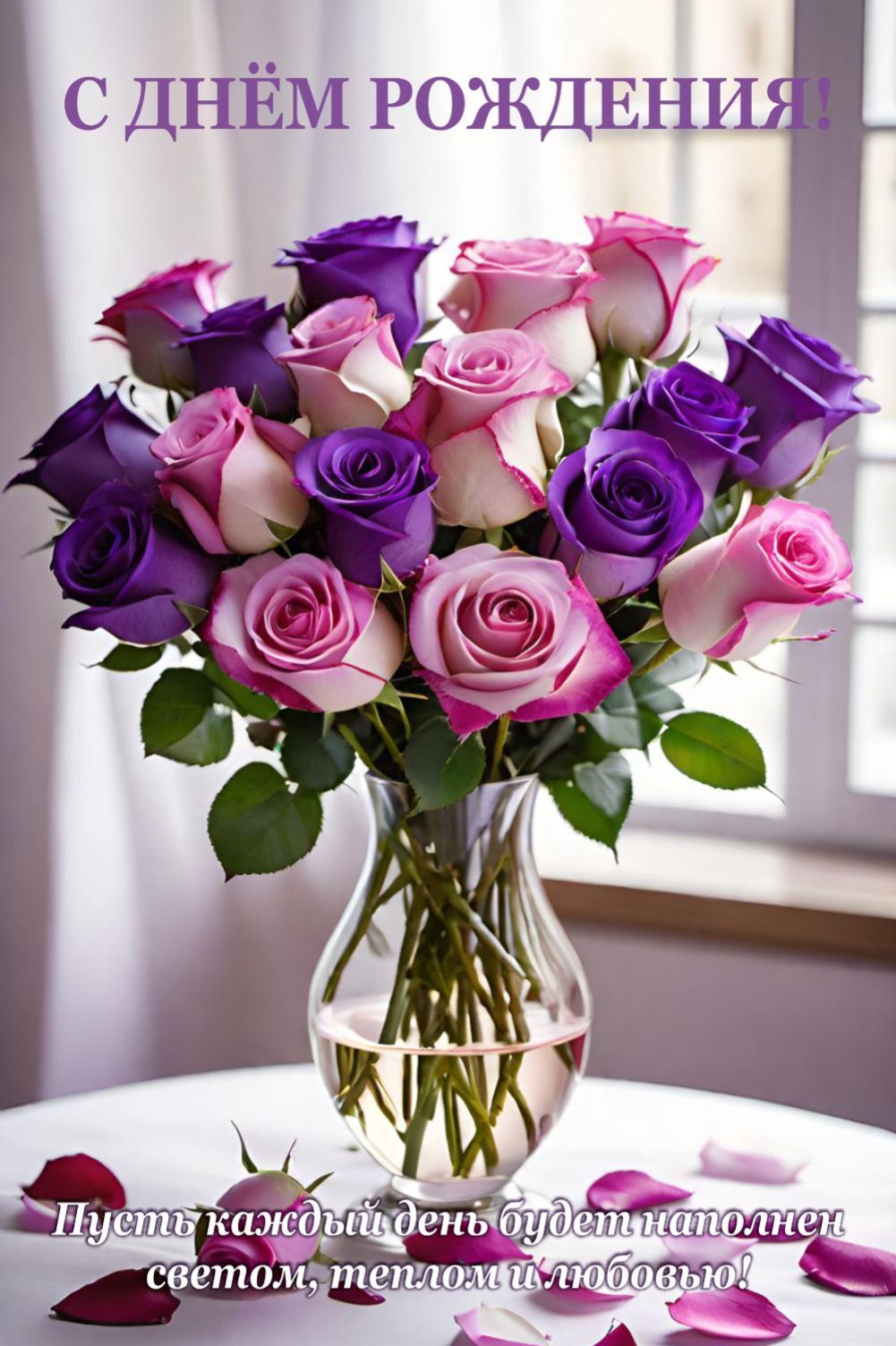 Открытка с днем рождения женщина. Красивые розы и пожелания.