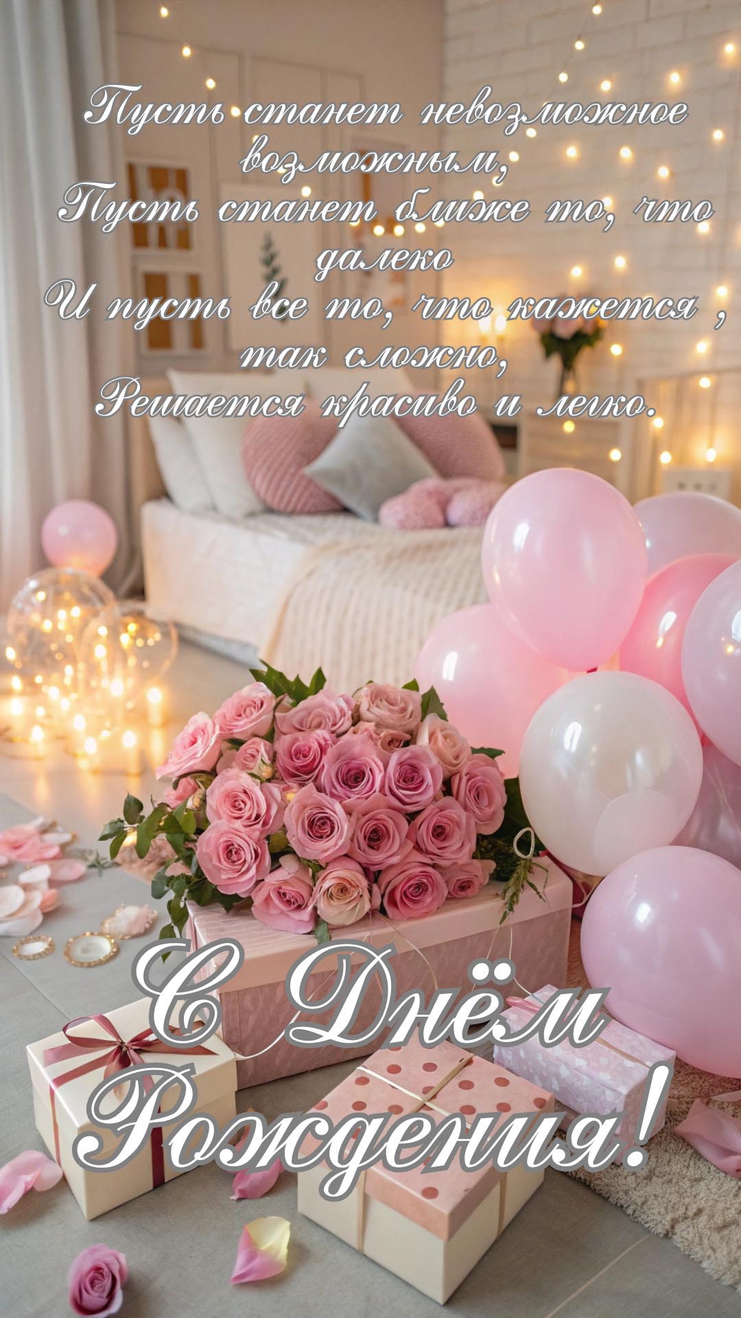 Открытка с днем рождения женщина. Пожелания, цветы, шарики и подарки в нежных розовых тонах.