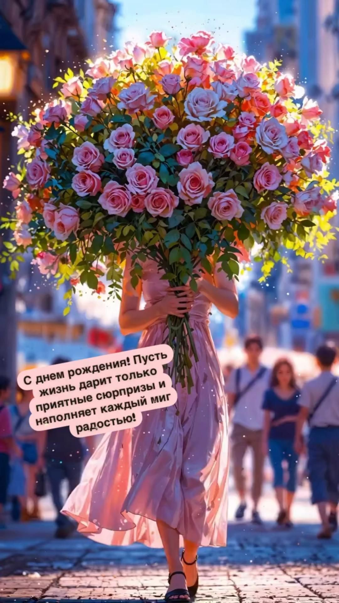 Открытка с днем рождения женщина. Пожелания, девушка с огромным букетом розовых роз.