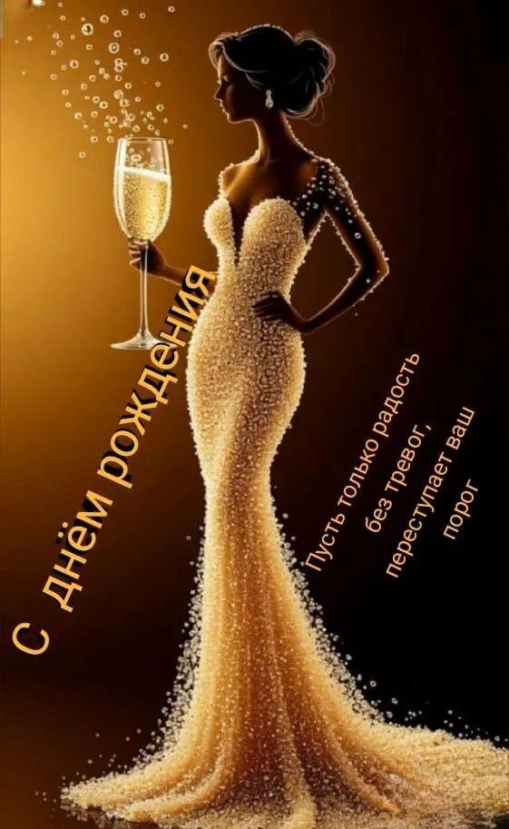 Открытка с днем рождения женщина. Пожелания, девушка в платье с бокалом.